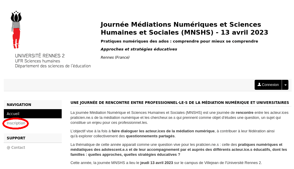 Mais ce n’est pas fini ! Vous n’êtes pas encore inscrit.e à l’événement ! Il faut maintenant retourner à nouveau sur le lien « Inscription » dans la colonne de gauche, puis choisir le bouton « Connexion« .