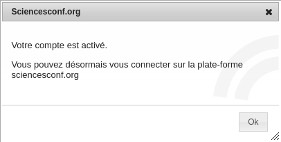 Après avoir cliqué sur le lien dans votre e-mail, vous allez avoir la confirmation de votre inscription sur la plateforme SciencesConf.